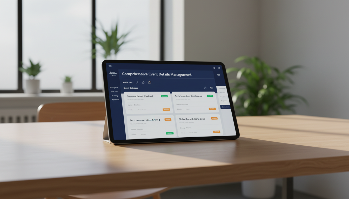 Store and configure all event information including venue, description, pricing, and status. This ensures consistent presentation and easy maintenance across all listings.